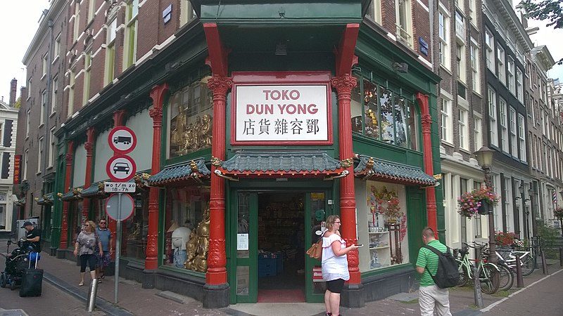 Uma das maiores lojas de departamento chinesas da Europa é a Toko Dun Yong. Com pilares vermelhos e fachada verde, o edifício de cinco andares é um marco arquitetônico da Chinatown de Amsterdã.