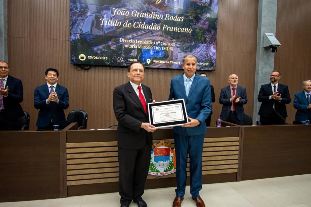O Professor João Grandino Rodas recebeu o título de Cidadão Francano em cerimônia realizada na Câmara Municipal de Franca (SP). Estavam presentes autoridades, parlamentares, juristas e acadêmicos.
